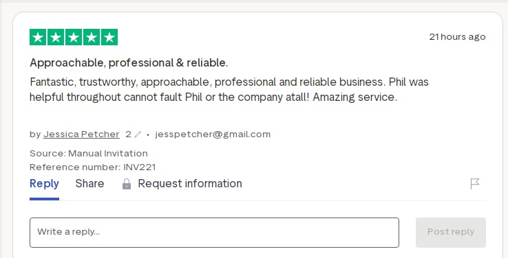 Fantastic, trustworthy, approachable, professional and reliable business. Phil was helpful throughout cannot fault Phil or the company at all! Amazing service.
